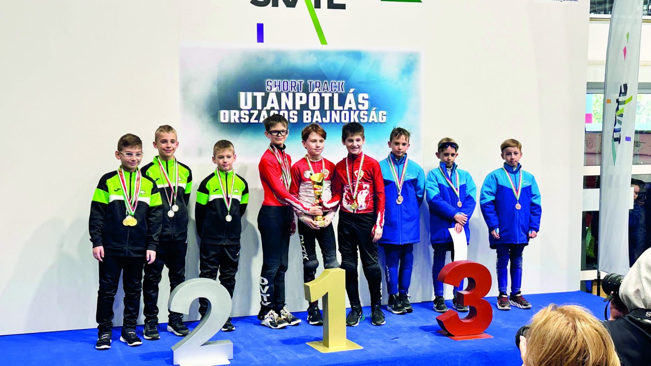 GYORSKORCSOLYA. Budapesten rendezték meg március 20-22-én a Rövidpályás Gyorskorcsolya Utánpótlás Országos Bajnokságot. A Tiszaújvárosi Széchenyi István Általános Iskola 5. a osztályos tanulója, Harnisféger Bence (jobbról a negyedik) két DVTK-ás társával aranyérmet szerzett a 2000 m-es váltó versenyszámban. Március 28-29-én a debreceni jégcsarnokban rendezték a 2025/2026-os tanév Rövidpályás Gyorskorcsolya Diákolimpia Országos Döntőjét. A profi kategóriában egyéni rövid- és hosszútávú futamokban versenyző Bence mindkét távon a nagyon előkelő 5. helyen végzett, értékes pontokat szerezve iskolájának.