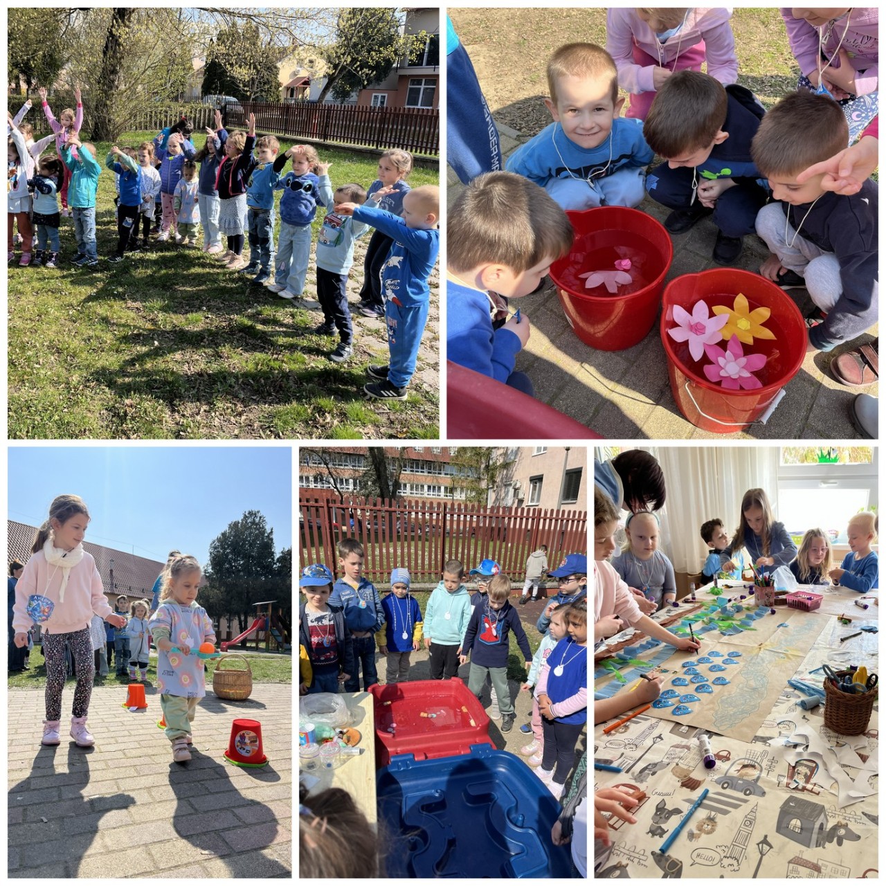 játékos mozgás során végigkísérték a vízcsepp útját: a felhőből indulva esőcseppként hullottak a földre, patakká, majd hullámzó tengerré alakultak, így élményszerűen tapasztalhatták meg a víz körforgását. A program ezt követően az óvoda udvarán azzal folytatódott, hogy a gyermekek változatos állomásokon vehettek részt. Két ügyességi pálya, egy kísérletező állomás, valamint egy kreatív foglalkozás biztosított lehetőséget a tanulásra és a közös élményszerzésre. A kísérletező állomás különösen nagy sikert aratott. A gyermekek megfigyelték, mely tárgyak süllyednek el, és melyek maradnak a víz felszínén, egyszerű eszközök segítségével „nagyítót" készítettek, valamint azt is kipróbálták, hogy a vízbe dobott különböző tárgyak milyen hullámokat keltenek.