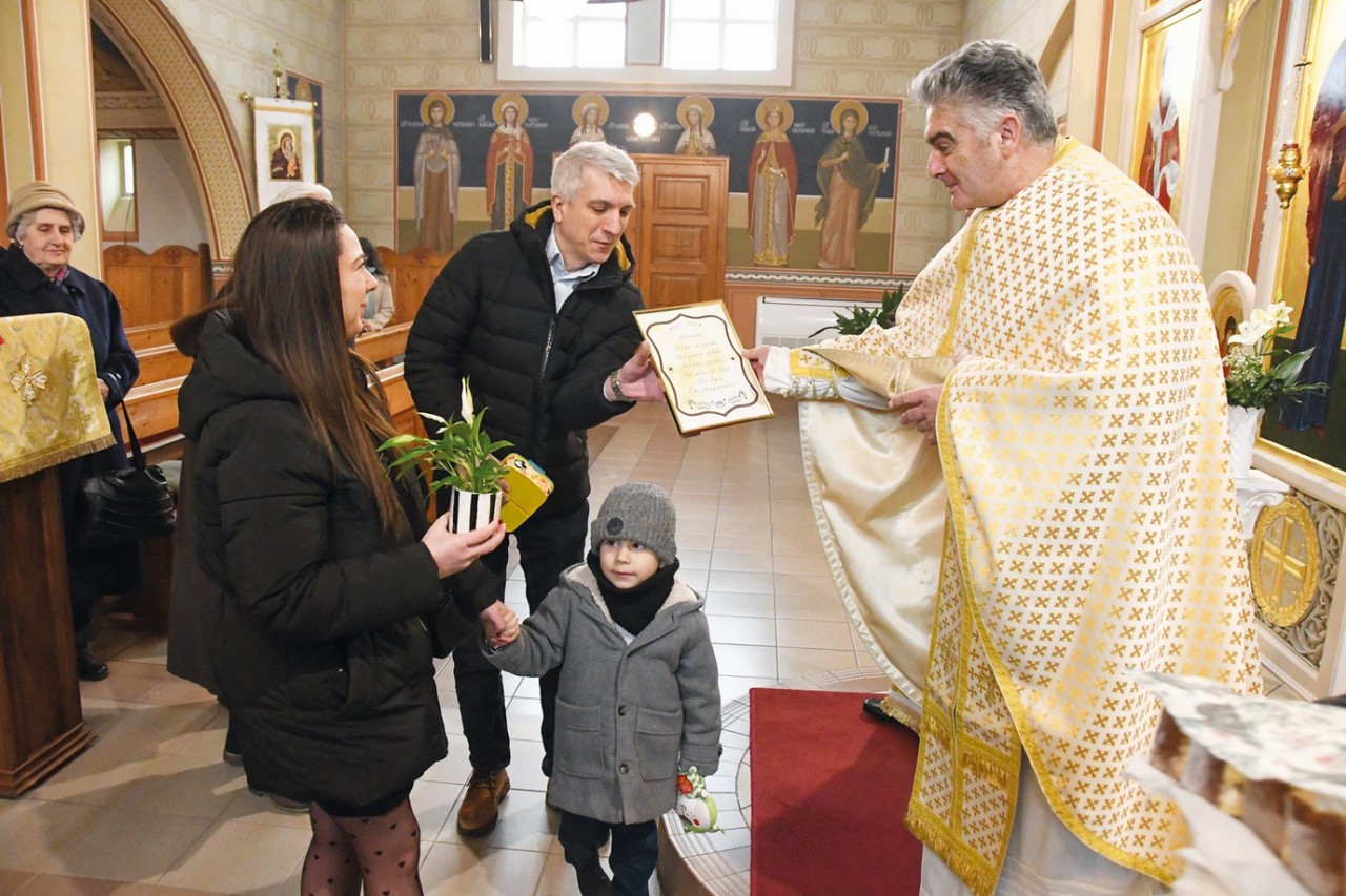 Miklós atyáék lánya, Veronika és férje Petrohai Bence kisfiukkal Nyíregyházáról érkezett a vasárnapi Szent Liturgiára. Mielőtt az atya megáldotta őket, nekünk meséltek a közös életükről, a hűségről és a házasság fontosságáról. Bence: Mi 2014 januárjában ismerkedtünk meg, immár 12 éve vagyunk együtt. A lánykérés 2017-ben volt, az egyik kedvenc balatoni településünkön, Keszthelyen a Festetics kastélyban kértem meg Veronika kezét. Én úgy gondolom, ketten egy párként nagyon jól kiegészítjük egymást, egymást átsegítjük mindig a nehezebb időszakon, illetve támogatjuk egymást mindenben. Számunkra ez egy harmonikus kapcsolat.